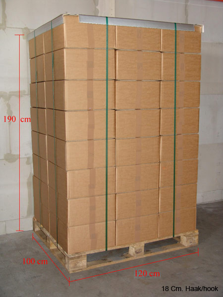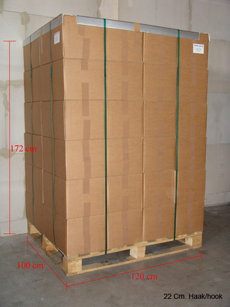 | Afmeting | Stuks p/doos | Kg/doos | Dozen per plt. | Stuks per plt. | Gewicht per plt. |